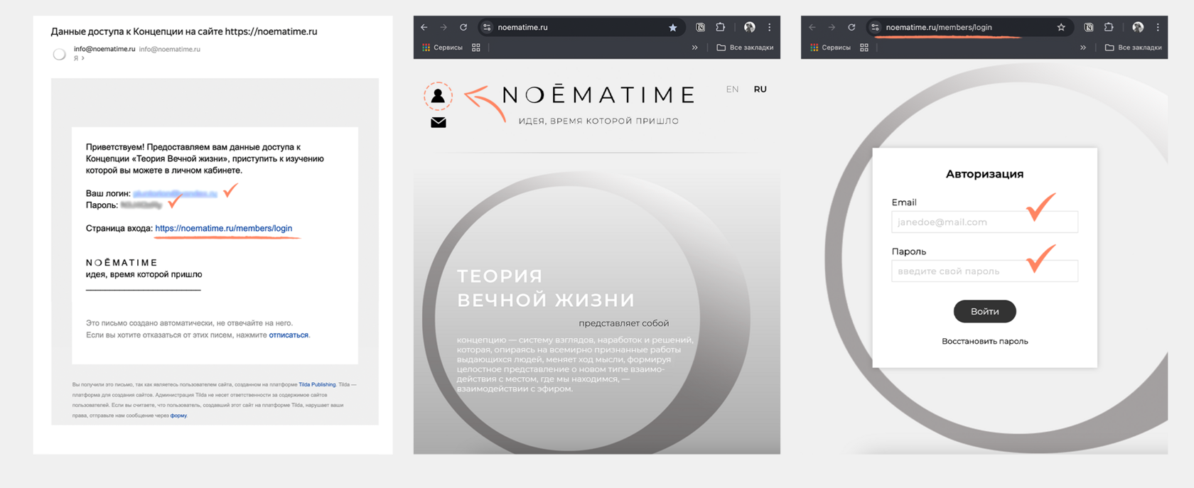 После совершения оплаты вам придёт на указанный при оформлении заказа email-адрес письмо с темой «Данные доступа к Концепции на сайте https://noematime.ru», в котором будут предоставлены Логин и Пароль для входа в личный кабинет: